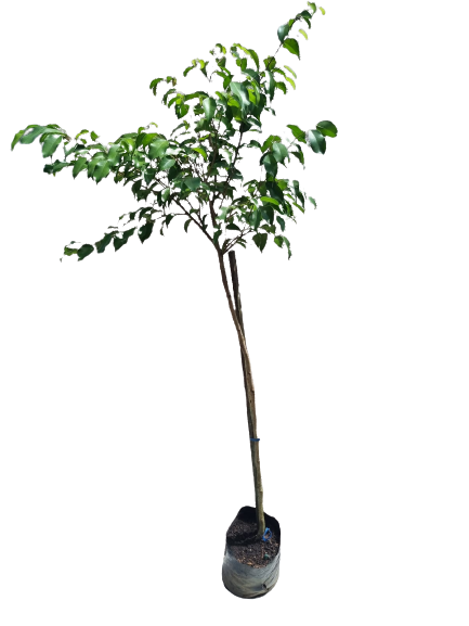 a tree reaching 30 m (98 feet) tall in natural conditions, with gracefully drooping branchlets and glossy leaves 6–13 cm , oval with an acuminate tip. The bark is light gray and smooth. The bark of young branches is brownish. The widely spread, highly branching tree top often covers a diameter of 10 meters. It is a relatively small-leaved fig. The changeable leaves are simple, entire and stalked.