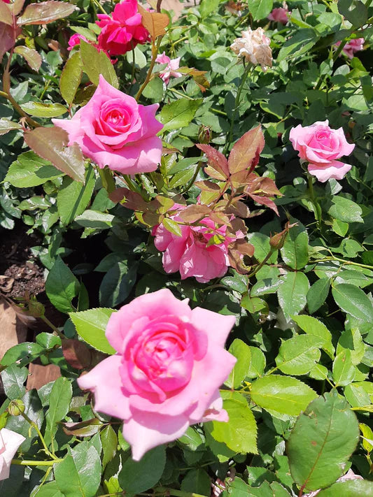 Deep pink. Mild, wild rose fragrance. Semi-double (9-16 petals) bloom form. Blooms in flushes throughout the season.